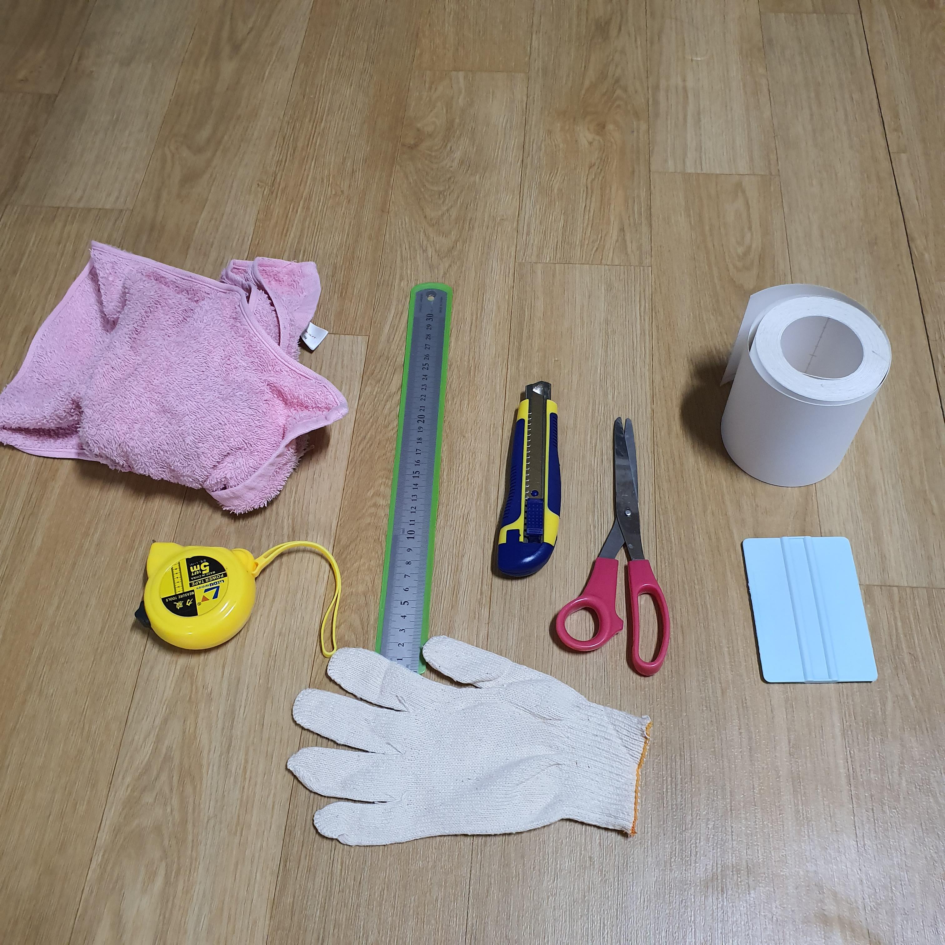 자, 칼, 가위, 목장갑, 플라스틱 헤라, 줄자, 쓰지 않는 마른걸레